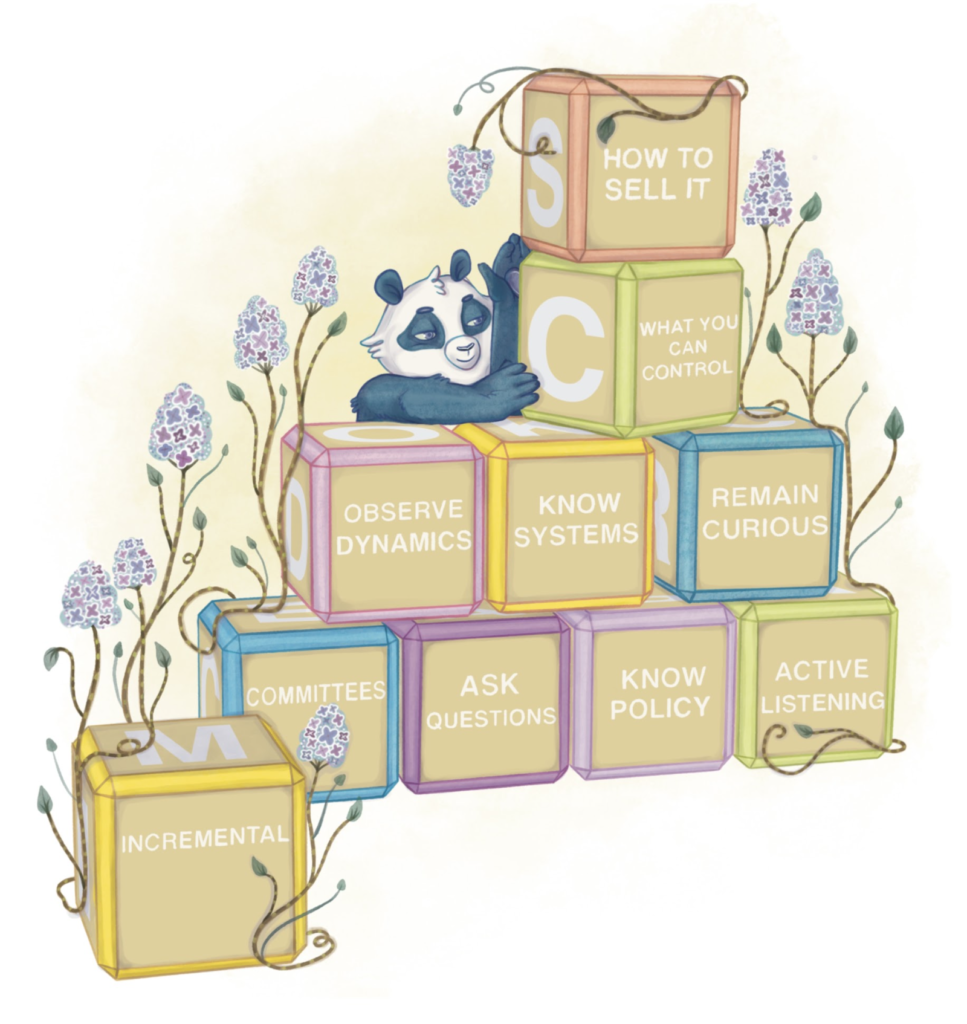 remaining curious, asking strategic questions, becoming critically familiar with the policies and systems one is working in, observing dynamics, and active listening.